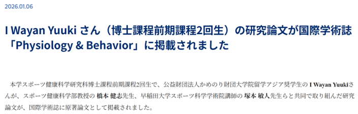 また、先月アクセプトされた論文に関する記事が、大学ホームページにも掲載されました(掲載URL:こちらから)。博士課程のスタートラインに立つ前にこの経験を積めたことは大きな財産であり、機会を与えてくださった先生方や環境に、改めて感謝しています。現在は、2本目となる論文(続編)の執筆を開始しました。博士では修士に比べてヒントが少なく、自分で問いを立て、見つけ、考え抜く力がより強く求められます。正直なところ、いまの自分はまだ博士のスタートラインに立つ準備が十分にできていないと感じています。だからこそ、残りの3か月で試行錯誤を重ね、悩み抜きながら、力をつけていきたいです。