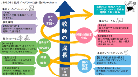 教師プログラムには、東南アジアの中学や高校で日本語を教えている教師10名が参加しました。タイに来る前にオンラインセッションを2回おこない、準備を整えて集合フォーラムに臨みました。教師プログラムは、フォーラムの活動を通じて自分の授業を振り返り、国に帰って実践できる具体的な活動案を考えることを最大の目標にしました。一連の取り組みを段階的にわかりやすく示すため、以下の教師プログラムの流れ図を作成して活動内容を参加教師に周知しました。