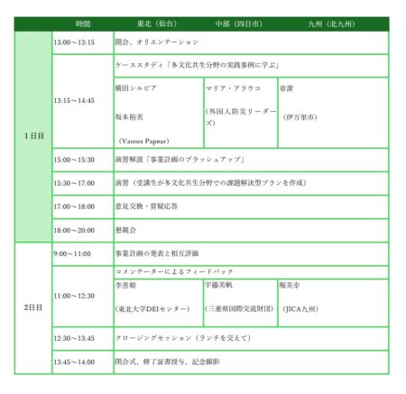 まず本年度は、地域の担い手に必要な多文化共生分野の知識と、組織や事業のマネジメントに必要なスキルを学ぶ研修の場として、一般財団法人ダイバーシティ研究所のご協力のもと「かめのり多文化共生塾2025」を2025 年9月29 日(月)~9月30日(火)に仙台、2025年11月13日(木)~14日(金)に四日市、12月8日(木)~9日(金)に北九州にて行いました。